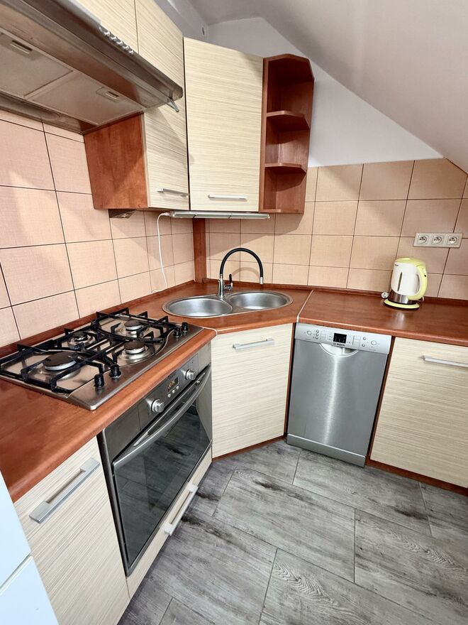 Kuchnia umeblowana ze sprzętem: piekarnik, płyta gazowa, zmywarka, lodówka.