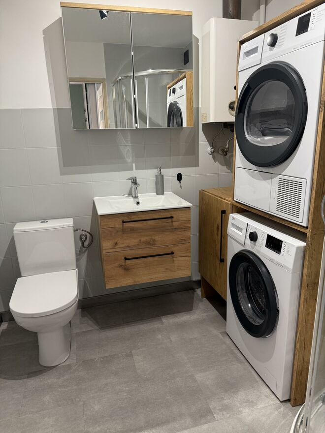 W łazience na wyposażeniu pralka oraz suszarka. W pokoju telewizor.