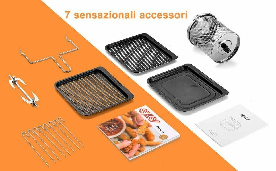 Akcesoria w zestawie: tacki do suszenia i gotowania wieloetapowego, 6 szaszłyków do grillowania, 1 kosz na rożen i frytki, 1 rożen na szaszłyki z kurczaka lub pieczeni, 1 tacka ociekowa i 1 narzędzie do wyjmowania.